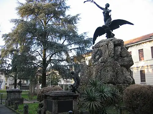The complex, sculpted in bronze and stone,[1] in the Scapigliatura style,[1] adopted by Bazzaro in his early years after meeting Tranquillo Cremona.[2] Scapigliatura proposed to abandon the academic technicality of late-romantic style, conveying reality with a "restless sentimentality".[5] The War Memorial of Brugherio is characterized by "dramatic tension"[1][6] derived from the dichotomy between the complex gesture of its two soldiers at the foot of a rock on which stands Victory, leaning against an eagle. Victory leans towards the exterior and is therefore dynamic. The soldiers are separated from Victory by an imposing stone block,[1] and are said to be "isolated in their spiritual and psychological tension". Victory offers the soldiers a compassionate gesture, and is shown as about to throw a rose at the soldier who came to the rescue of his dead comrade.[1] The soldier, aware of the goddess, turns to her, anxious and upset, to collect the gift. The dramatic tension which accompanies the juxtaposition of the goddess and the soldiers, can also be appreciated between the two soldiers themselves: one lifeless, lying on the ground;[7] the second, is desperate and caught in anguish, as shown by his arm being extended towards the merciful god.