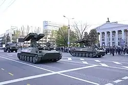 Ukrainian troops launched another attack on insurgents in Mariupol on 9 May. A police building occupied by insurgents was set alight by government forces, causing the insurgents to flee.[144] Internal Affairs minister Avakov said that 60 insurgents attacked the police building, not Ukrainian troops and that the police and other government forces had managed to repel the insurgents. Between six and twenty militants were killed, along with one police officer.[145] Four militants were captured, and five policemen were wounded.[146] During the fighting, pro-Russian protesters seized one armoured personnel carrier, and afterwards barricaded the city centre with tyres.[145] The same day, separatists attempting to disarm Ukrainian troops near Donetsk were met with warning shots, and 100 were detained.[147] Also, an unnamed UOC-MP priest attempted to negotiate with separatists near Druzhkivka, but was later killed after being shot eight times.[148][149]