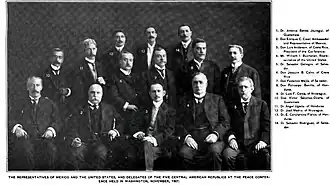 On 14 November 1907, the United States opened a peace conference in Washington D.C. to end the war, in which the five nations of Central America, Costa Rica, El Salvador, Guatemala, Honduras, and Nicaragua were invited.[25][26][27][28] Honduras and Nicaragua presented a plan to reestablish a Central American union, but the plan met objections from the delegates from Costa Rica, El Salvador, and Guatemala, and the proposal eventually was dropped.[29] On 20 December 1907, the five nations signed the treaty which established the Central American Court of Justice.[27][30] The Court held its first session on 1 January 1909.[30]
