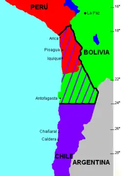 The conflict is also known as the "Saltpeter War", the "Ten Cents War" (in reference to the controversial ten-centavo tax imposed by the Bolivian government), the "Nitrate War",[10] and the "Second Pacific War".[11] It is not to be confused with the pre-Columbian Saltpeter War, in what is now Mexico, nor the "Guano War" as the Chincha Islands War is sometimes named.[12] The war largely settled (or set up, depending on one's point of view) the "Tacna-Arica dispute" or "Tacna-Arica controversy",[13][14] and is sometimes known by that name as well, although the details took decades to resolve.