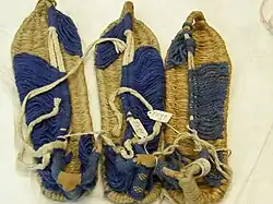 Waraji resemble other forms of traditional Japanese footwear, such as zori and geta, with a few key differences. They were historically the simplest form of outdoor footwear (sandals of any type were not worn indoors).[1] Waraji, due to their cheap and rustic nature, are considered to be a very informal type of footwear, and are not worn with formal kimono. They are typically worn with tabi socks, and are woven so that the wearer's toes generally protrude slightly over the edge of the shoe.[2][1]