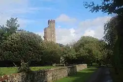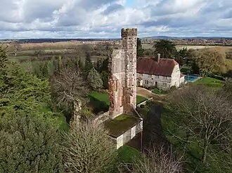Today, the turret, the arch of the gate and the drawbridge support in the moat still survive.[6] The land remains private property.[17] The remains of the castle is a grade II* listed building and a scheduled monument.[7] The Listing specifics define it as a "gateway tower, including the moulded stone arch of the gate, some of the south wall of the tower, a complete south-east octagonal stair turret, of 5 storeys, and part of the east wall (facing the courtyard)".[18]