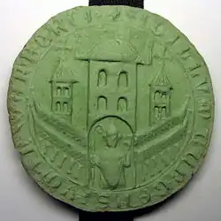 The two towns, the Old Town and the New Town, joined in 1436 into one town. In Der Grote Breff ("The Great Letter"), the newly united town's constitution was precisely framed and sealed. Both former towns' seals are to be seen on the Great Letter. On the cast seal (in the picture), two defensive towers with a double wall are to be seen. Under the town gate stands the Bishop of Paderborn with a staff. The circumscription reads: "Sigillium burgensium in wartborch". The Great Letter is written in Middle Low German, the Hanseatic League's language, and stands as a substantial legal document.