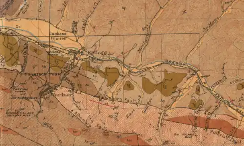 - ^ Ransome, Frederick; Calkins, Frank (1908). The geology and ore deposits of the Coeur d'Alene district, Idaho, USGS Professional Paper 62. Washington: U.S. Dept. of the Interior, USGS, Government Printing Office. p. 22. doi:10.3133/pp62. Retrieved November 21, 2018.