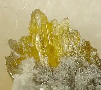 Warikahnite is a rare zinc arsenate mineral of the triclinic crystal system with Hermann-Mauguin notation 1, belonging to the space group P1.[6] It occurs in the Tsumeb mine in Namibia on corroded tennantite in the second oxidation zone under hydrothermal conditions in a dolomite-hosted polymetallic ore deposit.[5][7] It is associated with adamite, stranskiite, koritnigite, claudetite, tsumcorite, and ludlockite. The origin of discovery was in a dolomite ore formation within an oxidized hydrothermal zone, in the E9 pillar, 31st level of the Tsumeb Mine in Namibia, Southwest Africa.[2][5] It has also been found at Lavrion, Greece and Plaka, Greece as microscopic white needles.[6]