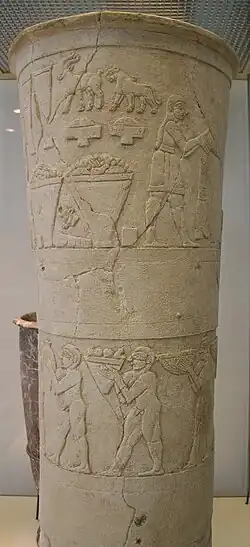 The vase has three registers – or tiers – of carving. The bottom register depicts the vegetation in the Tigris and Euphrates delta, such as the natural reeds and cultivated grain. Above this vegetation is a procession of animals, such as ram and sheep presented in a strict profile view. The procession continues in the second register with nude males carrying bowls and jars of sacrificial elements, such as fruit and grain. The top register is a full scene, rather than a continuous pattern. In this register, the procession ends at the temple area. A female deity stands with two bundles of reeds behind her. She is being offered a bowl of fruit and grain by a nude figure. A ruler-figure dressed in a ceremonial kilt and long belt faces her leading the procession.[7][8]