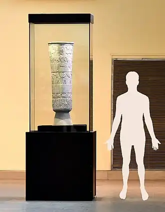 The Warka Vase or Uruk vase is a slim carved alabaster vessel found in a temple complex in the ruins of the ancient city of Uruk, located in the modern Al Muthanna Governorate, in southern Iraq. Like the Uruk Trough, Mask of Warka, and the Narmer Palette from Egypt, it is one of the earliest surviving works of narrative relief sculpture, found, no in situ, in a layer dated to c. 3100–2900 BC. Simple relief sculpture is also known from much earlier periods, from the site of Göbekli Tepe, dating to circa 9000 BC.[1]