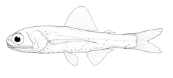 Warming's lantern fish grows to a length of about 8 cm (3.15 in). The rounded dorsal fin has 13 to 15 soft rays and the anal fin has a similar number of soft rays.[2] The body has patches and scale-like specks of bioluminescent material.[3]
