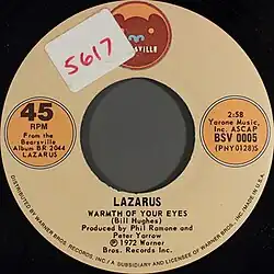 "Warmth of Your Eyes" is a song written by American singer-songwriter Billie Hughes. The song was produced by Peter Yarrow, of Peter, Paul and Mary, and Phil Ramone and released in 1972 as a single by Lazarus on the band's debut eponymous Lazarus album by Bearsville Records, distributed by Warner Bros. Records Inc.[1][2][3][4][5]