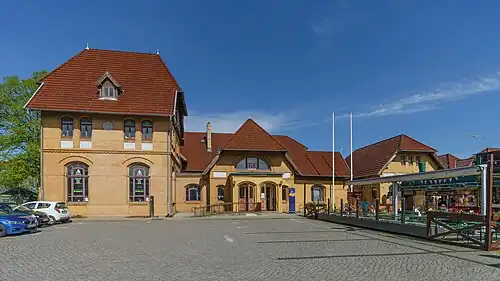 The station building is located north of the platforms on the station forecourt (Bahnhofsvorplatz). On the middle platform there is a building that was formerly used as the waiting room for the grand duke.