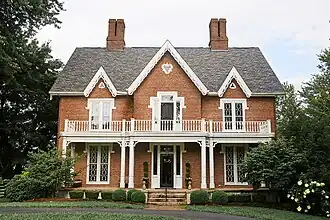 With its “gingerbread” style architecture, Warrenwood Manor is one example of Gothic Revival architecture in Kentucky. The house rests on a stone foundation that was constructed two years before the house was erected. Three gables on the front part of the house are trimmed in a white wood in the decorative “gingerbread” design. The roof of the porch, which extends nearly all the way across the three-story structure, is edged with a balustrade and is supported by eight slender columns.[5] Three large limestone steps lead up to the house from the lawn. Double windows with diamond-shaped glass panes across the front of the structure carry out the style of architecture in the mid-1800 period of early America.[5] The house walls are three bricks thick. The bricks for the home were made in kilns on the property and lumber from the forest on the lands was used in the interior of the home. The home also includes nine working fireplaces to heat each room. The rooms of the house are eighteen feet wide and ceilings fourteen feet high.[8]