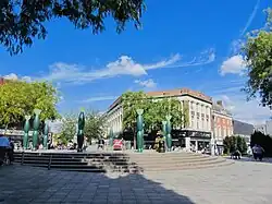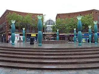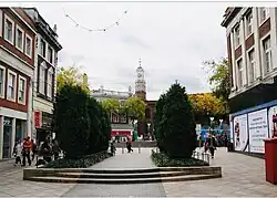The old Cockhedge Textile Mill was demolished and replaced by another shopping mall. The main shopping streets are Buttermarket Street, Horsemarket Street, Sankey Street and Bridge Street. Where these four streets intersect at Market Gate, there is a redevelopment with a large fountain and "guardians" (known locally as "the skittles") designed by Howard Ben Tré. Musical instrument retailer Dawsons Music originates in the town, and was located on Sankey Street from 1898 until 2019.[41] The town also has a large indoor market which was redeveloped as part of the Time Square development which brought the return of a cinema in the town centre along with office space, restaurants, bars and retail opportunities.[42]