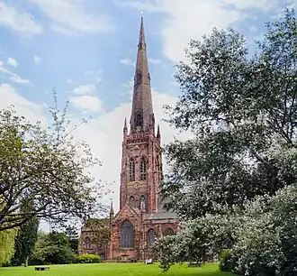 Warrington has been a major crossing point on the River Mersey since ancient times and there was a Romansettlement at Wilderspool.[10] Local archaeological evidence indicates that there were also Bronze Age settlements. In medieval times Warrington's importance was as a market town and bridging point of the River Mersey. The first reference to a bridge at Warrington is found in 1285.[11] The origin of the modern town was located in the area around St Elphin's Church, now included in the Church StreetConservation Area,[12] established whilst the main river crossing was via a ford approximately 1 km upriver of Warrington Bridge.[13] Warrington was the first paved town in Lancashire, which took place in 1321.[14]