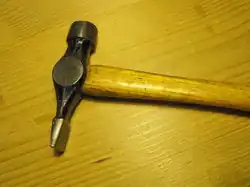 The Warrington hammer, joiners' hammer, English pattern hammer, or Warrington pattern hammer is a kind of cross-peen hammer used in woodworking.[1][2][3][4][5][6] The chisel-like cross-peen side is used to set small nails and pins while the smaller, rounded face is used to finish driving them in. The cross-peen side of the tool is also used for refining work, such as furniture and cabinet making. While the standard claw hammer is used for tasks that involve greater use of force, the Warrington hammer is preferred for projects that require precision. A standard Warrington hammer is commonly around 12+1⁄2 inches (320 mm) in length with the hammer head weighing between 10 and 14 ounces (280 and 400 g).[7][8]