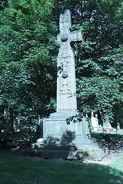Several eminent sculptors' work is found in the cemetery, including a fine portrait of William Young, horticulturist (1816–1896) by William Birnie Rhind, a monument to Robert Bryson by Thomas Stuart Burnett,[8] and a wealth of fine ornate Celtic crosses by the McGlashens. A sizeable arched pedestal to the Rev James Peddie (d. 1845) by John Dick Peddie is also of note.