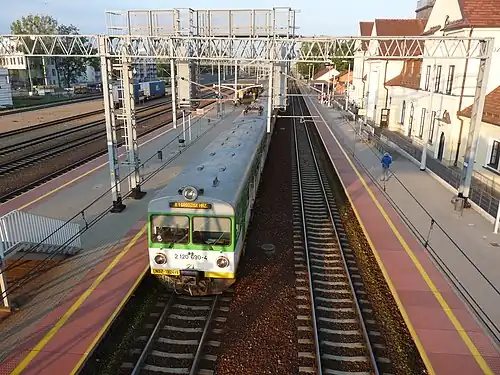 The line was originally opened in 1845 as part of Warsaw–Vienna railway[1] and electrified between 1936 and 1937. During the interbellum with the construction of the Warsaw Cross-City line authorities planned to upgrade the line to four tracks, but delayed the investment due to lack of funding. A second set of tracks was built only in 1959,[2] since then the original southern tracks, today designated as line number 447, are dedicated for suburban connections, while the newer northern ones running parallel to them, today a part of line number 1, serve long-distance passenger and goods trains.