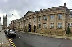 There are three tiers of local government covering Warwick, at parish (town), district, and county level: Warwick Town Council, Warwick District Council and Warwickshire County Council. The town council is based at the Court House on Jury Street, which was completed in 1731.[46][47] The district council, although taking its name from Warwick, is based in the neighbouring town of Leamington Spa. Warwickshire County Council has its headquarters at Shire Hall, a complex of buildings between Market Place and Northgate Street in the centre of Warwick.