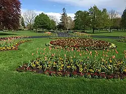 The town's Priory was founded in around 1119 by Henry de Beaumont, the first Earl of Warwick. It was later destroyed during the Dissolution of the Monasteries in 1536, it stood on the site of the current Priory Park.[23] Henry de Beaumont also founded the Hospital of St John near the east town gate.[24] It is now the site of the 17th century St John's House.[25] Relatively few medieval buildings survive in Warwick, however one of the most notable examples is the Lord Leycester Hospital on the High Street, whose oldest parts date from 1383.[26] Warwick was not incorporated as a borough until 1545.[15]
