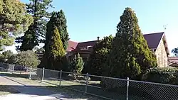 Internally, the building is divided into four large rooms. At the front is the gabled entry to the southern wing currently used for school administration. The northern wing houses the library and the western wing is divided into two rooms currently used for music and storage rooms.[1]