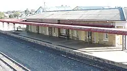 The station building is also a single-storeyed sandstone building on a north–south axis, with the platform running along its eastern side. The western facade features an entrance portico and verandah. The roof is hipped and mainly of corrugated asbestos cement sheet, apart from the kitchen wing which is corrugated iron. Above the roof are two rendered chimneys with decorative mouldings and a cornice. There is a cantilevered steel awning over the platform, which continues past the Station building in both directions.[1]