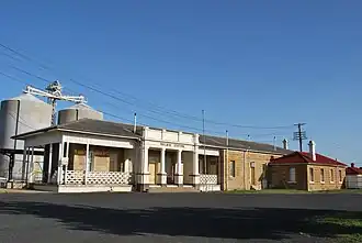 The Goods Shed is a single-storeyed sandstone building, situated to the north of the Station. A narrow linear building on a north–south axis, it measures some 70 metres (230 ft) in length by 11 metres (36 ft) in width. The gabled roof is of corrugated iron, with translucent skylight panels and a deep overhang on the western side protecting the loading bays. The stonework is of picked finish with draughted margins, laid as coursed ashlar. Added to the south of the building is a small timber office, and to the west is a recent steel canopy structure. Inside the building is a railway siding, with the remainder being a timber platform. The building is still in use as a goods shed.[1]