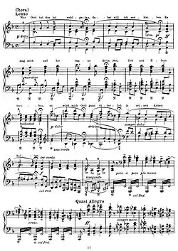 In the nineteenth century, Franz Liszt used the hymn in several compositions. In 1862, following the death of his daughter Blandine, he wrote his Variations on a theme of J. S. Bach, S180 for piano based on Weinen, Klagen, Sorgen, Zagen, BWV 12, with its closing chorale on "Was Gott tut, das ist wohlgetan" on the penultimate page above which Liszt wrote the words of the chorale. Walker (1997) describes the Variations as "a wonderful vehicle for his grief" and the Lutheran chorale as "an unmistakable reference to the personal loss that he himself had suffered, and his acceptance of it."[35] The hymn also appeared as the sixth piece (for chorus and organ) in Liszt's Deutsche Kirchenlieder, S.669a (1878–1879) and the first piece in his Zwölf alte deutsche geistliche Weisen, S.50 (1878–1879) for piano. It was also set in the first of the chorale preludes, Op.93 by the French organist and composer Alexandre Guilmant.[27][35]