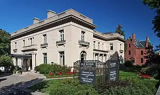 The Gale Mansion, at 2115 Stevens Avenue South, was built in 1912 to designs in the Renaissance Revival style by Ernest Kennedy of Minneapolis. In 1855, the 40-acre (16 ha) tract had been purchased for $50. Water company records indicate that several smaller houses once occupied the Stevens Avenue site.[4] The owner, Edward Chenery Gale, was the son of Minneapolis pioneer real estate broker Samuel Gale. His wife, Sara Belle Pillsbury, was a daughter of Governor John S. Pillsbury. The house, now owned by the American Association of University Women, is faced in Bedford limestone. Many modern features were part of the design: a central vacuum-cleaning unit, a kitchen at ground floor level, rather than secreted in the basement, an intercom system. The house was centrally heated with a coal furnace; the decorative fireplaces were infrequently used.[2] In the garden stands a fountain with the sculpture Boy with a Duck by Frederick MacMonnies.