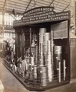 Founded in 1831, Washburn and Moen was an innovating manufacturer of wire and related products, including telegraph wire, which was used in large quantities during America's westward expansion. In 1874, Barb Fence Company of DeKalb, Illinois began purchasing wire from Washburn and Moen, to manufacture their patented barbed wire.[2] Washburn was curious as to why they bought so much wire; he travelled to DeKalb and persuaded Joseph Glidden, holder of the patent, to sell his half of the manufacturing business to them. Glidden agreed, but retained his royalties from his patent.[2][3] Glidden's partner, Isaac L. Ellwood, continued manufacture of barbed wire under the name I. L. Ellwood & Co. in DeKalb. Washburn and Moen manufactured barbed wire as well. The product had a large market of ranchers, farmers and railroads in the last quarter of the 19th century. The company acquired a manufacturing monopoly in barbed wire.[4]