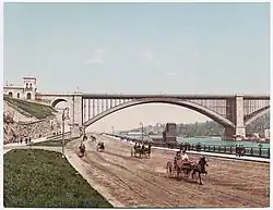 By the first week of May 1889, the Evening World reported that pedestrians and vehicles had been using the Washington Bridge for a week.[92] Ultimately, the bridge never formally opened because of disagreement between the city and the bridge commission.[6][23][93] In December 1889, members of the public decided to tear down the barricades that had barred access to the bridge.[93] When the first person jumped to his death from the Washington Bridge in August 1890, The New York Times reported that the bridge had been in use for eighteen months.[94] However, as late as 1891, the bridge was still recorded as being "unopened" because of disputes over maintenance.[95]