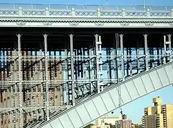 Unusually for arch bridges of the time, the deck lacks diagonal bracing, instead being supported by beams running horizontally and vertically.[4][32] The beams, spaced about 15 feet (4.6 m) apart, are built of plates and angles. Posts extend from the extrados of the ribs, supporting the floor beams. The posts are rigidly attached to the ribs' flanges and the horizontal and vertical beams; they are connected and braced transversely.[33]