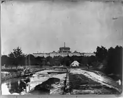 The canal was opened formally during late 1815.[6] The canal route began at the Eastern Branch, near the Washington Navy Yard and proceeded north and northwest. Another planned branch proceeded north and northeast from the estuary of James Creek, which divided Greenleaf Point from Buzzard Point but was only constructed in 1866 and never connected with the existing canal.[7] Past the point at which these two branches were planned to converge, a single canal channel traveled northward towards the Capitol, veered northwestward at the base of Jenkins Hill (Capitol Hill), and then turned again to the north to cross the area in which the National Mall is now located. The canal then turned sharply to the west, joining a straightened and channelized Tiber Creek, which had earlier flowed westward. After traveling westward along the route of Tiber Creek, the canal entered the Potomac River at the outlet of the creek, which was south of the White House.