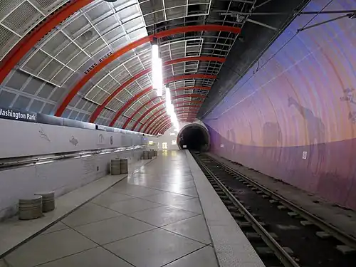 1998 | The Washington Park station is located beneath Les AuCoin Plaza, a scenic xeriscaped brick and stone terraced plaza located between the zoo and the World Forestry Center. The Washington Park Station is the only underground stop on the MAX Light Rail system and at 260 feet (79 m) below ground is the deepest transit station in North America.[37] The station is accessed by four high-speed elevators. It opened for service on September 12, 1998. |