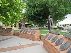 The first four statues and 24 bronze portraits making up the plaza were dedicated on May 10, 2003. The statues are of city founders Samuel J. Adair, Robert D. Covington, John P. Chidester, and Peter Neilson and were created (along with the bas reliefs) by local artist Jerry Anderson.[19][20] 26 additional bronze portraits were created and then dedicated at the plaza on May 7, 2004.[21]