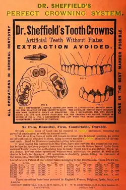 During his career, Sheffield worked at the cutting edge of dental prosthetics. He specialized in dental bridges and tooth crowns. In 1885, Sheffield was granted a patent for a dental bridge to hold multiple crowns together on broken or decayed teeth. In 1886, Sheffield and his son formed the International Tooth Crown Company, with Lucius T. Sheffield, as president and W. W. Sheffield, treasurer. This company purchased the crown patents of two prominent dentists, James E. Low and Cassius M. Richmond. All these crown and bridge patents were combined under one company which the two doctors advertised as Sheffield's Perfect Crowning System. Sheffield and his son received royalties from dentists around the world when they employed crowns and bridges covered under the Sheffields' patents.