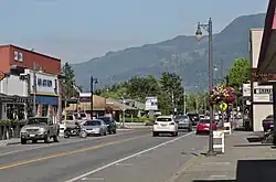 SR 544 begins at a roundabout with SR 539 (the Guide Meridian) on the south side of Wiser Lake near Lynden. The highway travels east on Pole Road through farmland and passes a housing subdivision near the Raspberry Ridge Golf Course.[2] SR 544 continues due east along Fourmile Creek and turns north at a junction with Everson Goshen Road near several gravel pits and the Nooksack Indian Reservation. After passing several industrial businesses, the highway turns northeast to enter Everson and turns north onto Mead Avenue near the city's elementary school. SR 544 then turns east once again at Kale Street and continues northeast onto Everson Road as it crosses the Nooksack River alongside a section of the Bay to Baker Trail.[3] The highway travels east through downtown Everson on Main Street, passing several businesses, the city hall, and a branch of the Whatcom County Library System.[4] SR 544 continues across a small patch of farmland to neighboring Nooksack, where it becomes Columbia Street and runs for several blocks on the southern outskirts of the town.[5] SR 544 terminates at a junction with SR 9, which uses a block Columbia Street to cross over the BNSF Railway's Sumas Subdivision before continuing north towards Sumas and south towards Sedro-Woolley.[6][7]