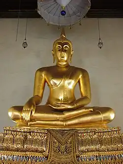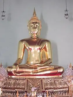 The main Buddha image in the ubosot is Luang Por Bunyarit (หลวงพ่อบุญฤทธิ์), sculpted during the reign of Rama III in Ayutthaya style. The Buddha image in the wihan is Pra Ruang Thong Kam (พระร่วงทองคำ), cast in Sukhothai style.[1] Pra Ruang is much older, dated back to Sukhothai period and made from 60 per cent gold.[7]