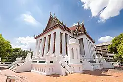 Wat Bowon Sathan Sutthawat (Thai: วัดบวรสถานสุทธาวาส) is a Thai temple in Bangkok. It's a historic temple in the area of the Front Palace, similar to Wat Phra Kaew inside the Grand Palace. Because the temple is situated in a palace, no monks live inside it. The temple is located at 4 Rachini Road, Phra Borom Maha Ratchawang Subdistrict, Phra Nakhon District, Bangkok within Bunditpatanasilpa Institute in front of foot of Phra Pinklao Bridge opposite the entrance of Soi Rambuttri near Tha Chang Wang Na and Bangkok Tourism Division, Culture, Sports and Tourism Department, next to the National Theater. This temple is also known as Wat Phra Kaew Wang Na (วัดพระแก้ววังหน้า; literally: "Temple of the Emerald Buddha at Front Palace").