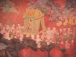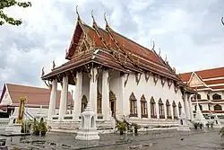 King Nangklao (Rama III), restored the temple and sponsored the painting of murals in the ordination hall by two famous artists named Luang Wichijesda or Kru Thong Yu and Chinese Luang Seniborirak or Kru Kong Pae. They competed with each other during the painting using a veil so their unfinished artwork could not be seen.[1] The murals are painted in traditional Thai-style depicting stories of Prince Nemi and Prince Mahosadha from the Mahanipata Jataka. The murals of this temple are considered masterpiece paintings of the Rattanakosin era with 80 percent preserved.[2][3] The architecture of the ordination hall is also of interest, the building being curved like a Chinese junk in the style of late Ayutthaya period.