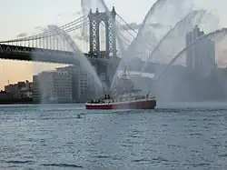 Water salutes have been used to mark the retirement of a senior airport employee, senior pilot or air traffic controller, the first or last flight of an airline to an airport, the first or last flight of a specific type of aircraft, as a token of respect for the remains of soldiers killed in action,[1] or other notable events. When Concorde flew its last flight in 2003 from John F. Kennedy International Airport, red, white and blue coloured plumes were used.[2]