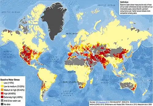pattern.[16] The cumulative area of the Arab region is approximately 10.2% of the world's area, but the region only receives 2.1% of the world's average annual precipitation. Further, the region accommodates 0.3% of the world's annual renewable water resources (ACSAD 1997). Consequently, the region has experienced a declining fresh water supply per capita, roughly a shortage of 42 cubic kilometers of water demand.[17] This shortage is expected to grow three times by 2030, and four times by 2050.[18] This is crucially alarming given the world's economic stability highly depends on the Arab region.[18]