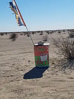 Water Station is a charitable organization, founded in 2001, that places water in remote locations throughout the Southern California desert where undocumented migrants are known to cross, in order to mitigate deaths that occur due to extreme heat exposure.[1] It started as a project by John Hunter, a San Diego resident, to place water jugs and flags in the deserts around El Centro, California.[2][3] The project later expanded to include additional volunteers maintaining hundreds of water stations.[4][5] By 2013 KPBS described the organization as "the largest, most organized and most consistent group leaving water for migrants in California's brutal Imperial Valley".[6] The charity operates primarily from April to October, and has permission from the Bureau of Land Management to place water and flags on public land.[7]