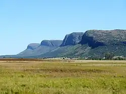 The Waterberg (Northern Sotho: Thaba Meetse) is a mountainous massif of approximately 654,033 hectare in north Limpopo Province, South Africa. The average height of the mountain range is 600 m with a few peaks rising up to 2,000 m above sea level. Vaalwater town is located just north of the mountain range. The extensive rock formation was shaped by hundreds of millions of years of riverine erosion to yield diverse bluff and butte landform.[2] The ecosystem can be characterised as a dry deciduous forest or Bushveld. Within the Waterberg there are archaeological finds dating to the Stone Age, and nearby are early evolutionary finds related to the origin of humans.
