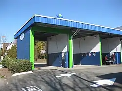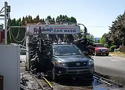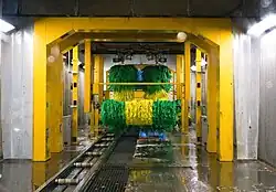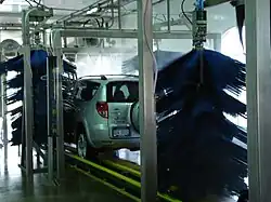 A car wash,[1] or auto wash, is a facility used to clean the exterior,[2] and in some cases the interior, of cars. Car washes can be self-service, full-service (with attendants who wash the vehicle), or fully automated (possibly connected to a filling station). Car washes may also be events where people pay to have their cars washed by volunteers, often using less specialized equipment, as a fundraiser.[3]
