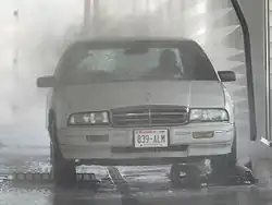 Like soft-touch car washes, touchless car washes are automated, with the vehicle passing through a tunnel where it is cleaned. However, touchless car washes do not use the foam or cloth applicators that soft-touch washes use; instead, they rely on high-pressure washers to clean and rinse the vehicle. Sensors utilized by these washes allow for a more precise clean along with the vehicle's exact shape.[16] To compensate for not physically contacting the vehicle, touchless washes use higher pressures and more caustic detergents than ordinary car washes.[17] Because the vehicle is not physically touched during a touchless wash, the vehicle is at a lower risk of being damaged. However, touchless washes have a harder time cleaning off tougher materials or reaching difficult-to-reach locations on vehicles, and their usage of stronger chemicals can potentially damage a vehicle's paint finish.[16][18]