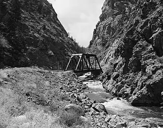 In the middle and late 1870s, the Denver, South Park and Pacific Railroad constructed the first railroad through the canyon and through the valley of the North Fork to South Park and eventually to Leadville and Gunnison. The line was initially a narrow gauge, and was later acquired by the Colorado and Southern Railway. Service on the line was terminated in 1937.