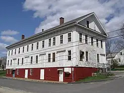 Company Store | The former company store, now occupied by the Connecticut Mop Manufacturing Company, was built in 1875. The 2½-story building was designed with a combination of Italianate and Greek Revival styles and has a clapboard-covered, asphalt-shingled roof. The Greek revival style is highlighted by the paneled corner pilasters while the Italianate detailing is shown by the cornice brackets and bracketed door hoods. The company store enabled workers to buy fresh food and milk that were produced in the company farm north of the village.[4] |