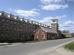 | Supervisors' houses | There are eight extant duplex supervisors' houses in the village that are located further uphill from the mill from the workers' houses. These supervisors' houses were built in two distinct time periods. The earliest houses were built with Greek revival elements with three of the surviving supervisor's houses exhibiting this style. The later houses (five surviving structures) are plainer-looking with some Victorian detailing. These houses have fieldstone foundations and gable roofs. The main facade has a central double entrance under a wide, flat-roofed portico and is six bays wide.[4] | |