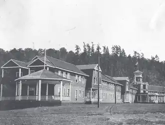On the night of August 19th, 1923, fire broke out in the centre block, originating either in the elevator shaft or the adjacent baggage room.[6] It quickly spread throughout the wooden structure, and reduced it to ashes in under half an hour. 8 people, all women, were killed in the immediate course of the blaze,[7] with a 9th woman dying four days later as a result of her injuries,[8] Several of the women who died were maids, sleeping in the bedrooms in the central tower, directly above where the flames originated.[1][6] Inquiries and investigations held after the fire revealed that there had been no fire alarm installed in the building, no signed escape routes and only inadequate fire-fighting equipment. In addition to this, the fire hydrants in the building were rendered useless because the water supply had been shut off at the main valve in the kitchen. Fire escapes from upper floor rooms mainly consisted of ropes, and even these were not provided in the rooms of the centre tower.[9]