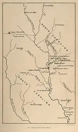 During the Battle of Waxhaws, a Loyalist cavalry force led by Lieutenant Colonel Banastre Tarleton easily defeated a force of approximately 350 Virginian Continentals under Colonel Abraham Buford, many of whom were killed as they were trying to surrender. The site of the battle is now the town of Buford, South Carolina.[4] The seventh president of the United States, Andrew Jackson, was born and raised in The Waxhaws region.[5] At the time of his birth, a border between the Carolinas did not exist. The exact site of his birth is uncertain.
