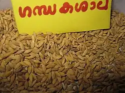 Gandhakasala rice is a variety of rice cultivated by the farmers in Wayanad District in Kerala. This is a scented variety of rice grown mostly by the members of the tribal communities of in Panamaram, Sultan Bathery, and Mananthavady areas in Wayanad.[1] As of 2010, gandhkasala is cultivated in an area of 327 hectares and jeerakasala in 22 hectares.[2] Wayanad Gandhakasala rice]] is known for its sandalwood-like flavor, while Wayanad Jeerakasala rice resembles cumin seeds in both appearance and taste and are so unique from one another.[3]